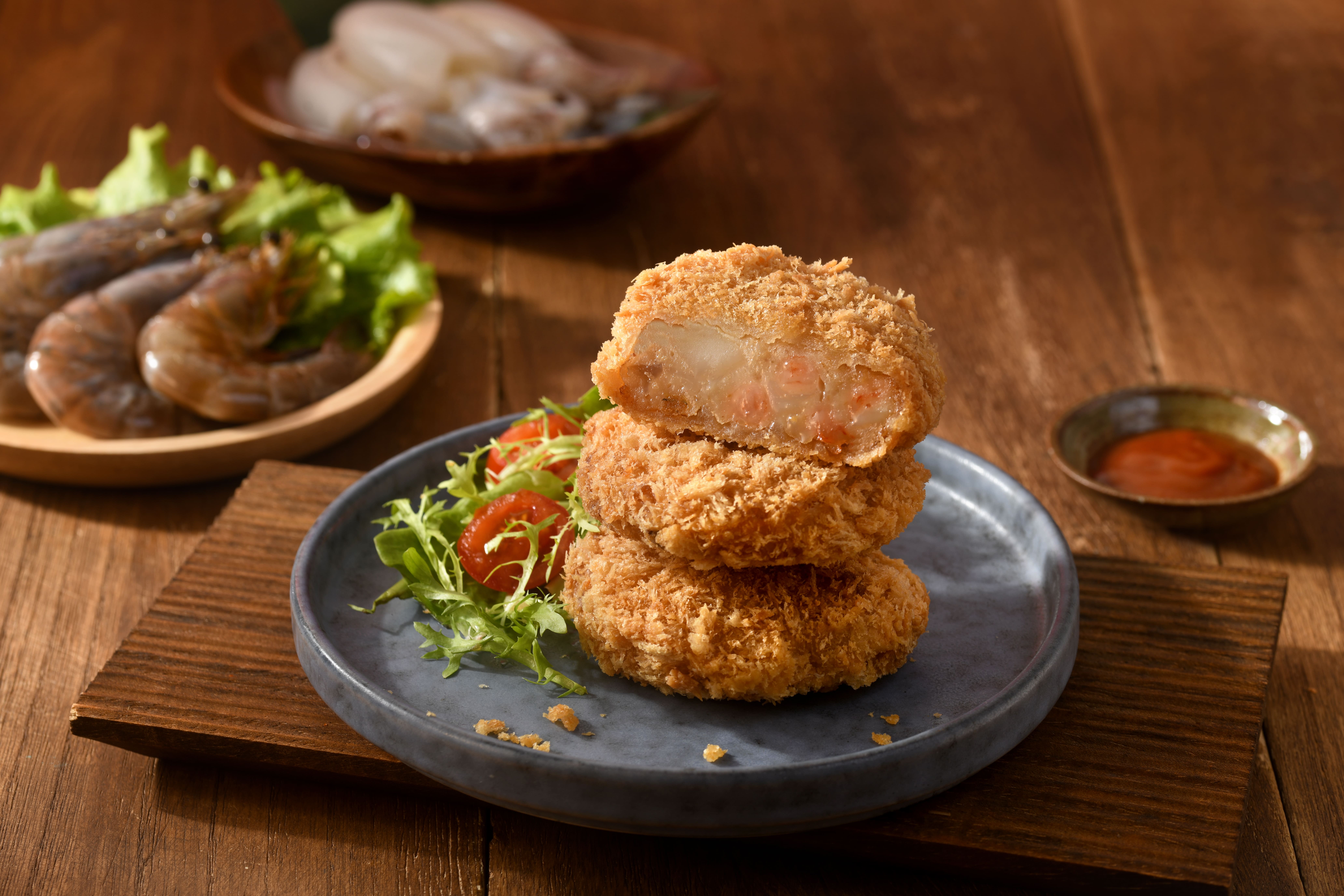 獨家工法將海鮮內餡與一層層的香脆麵包粉完美結合。經過烹調,外層金黃酥脆,內餡飽滿Q彈,每一口咬下都伴隨著「喀滋」聲,令人食慾大開!